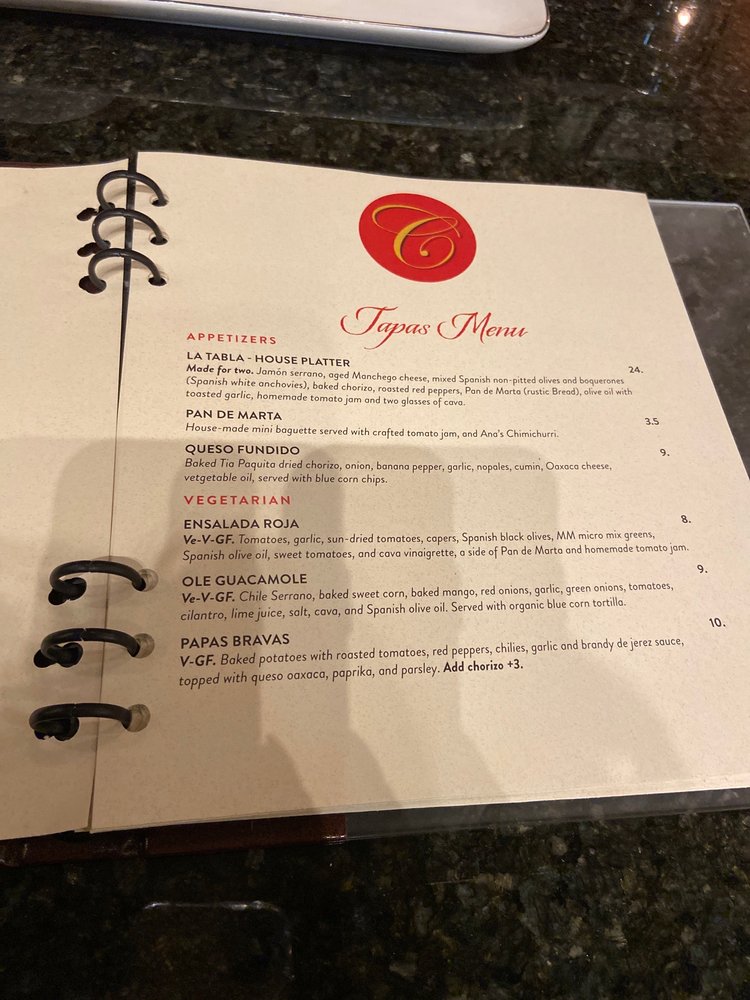 Whole roasted pepper filled with goat cheese, chorizo and almonds. Served with Spanish green sauce and a side of artisan baguette. Ask for tortilla chips if GF. Amazing!